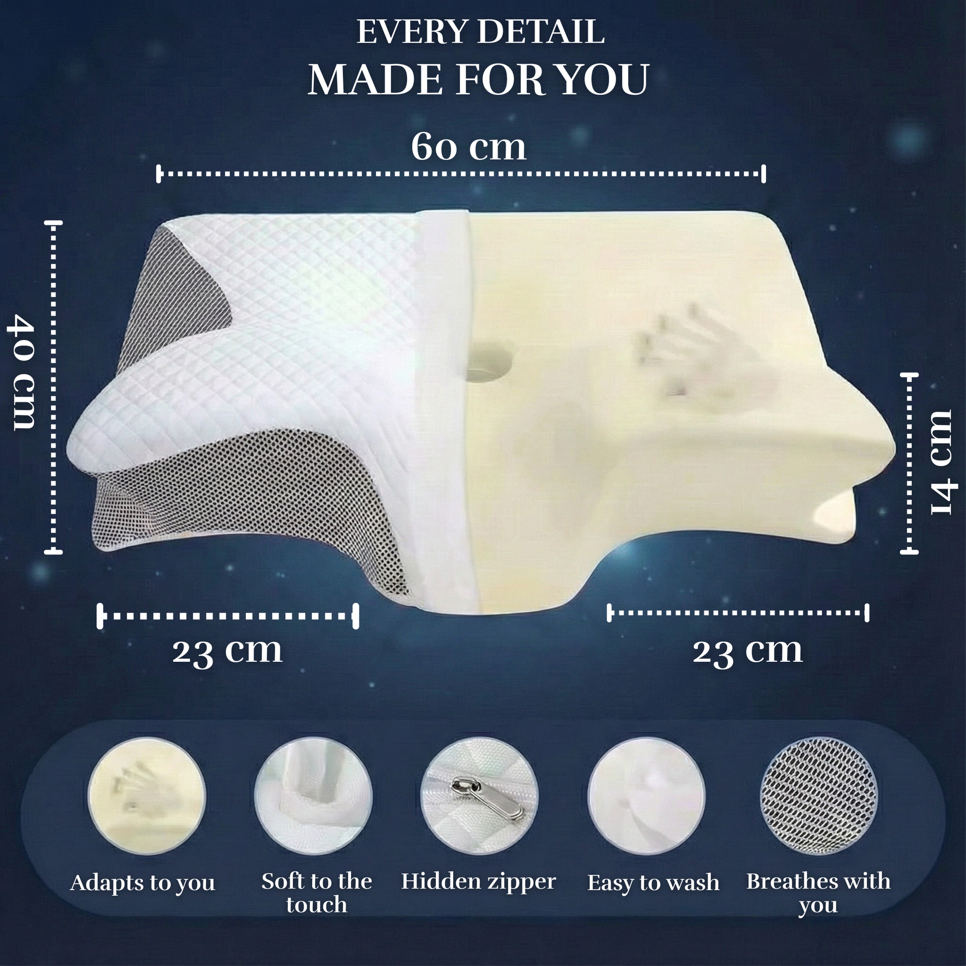 - El diseño asimétrico se adapta tanto si duermes de lado (usando la parte más elevada) como boca arriba (usando la zona central).